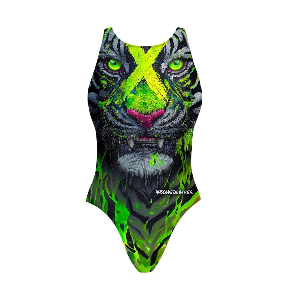 Training one-piece swimsuit, Pinup model. "Acid" print: predator's gaze, neon X, acid green on black - strong presence, readable in the pool.