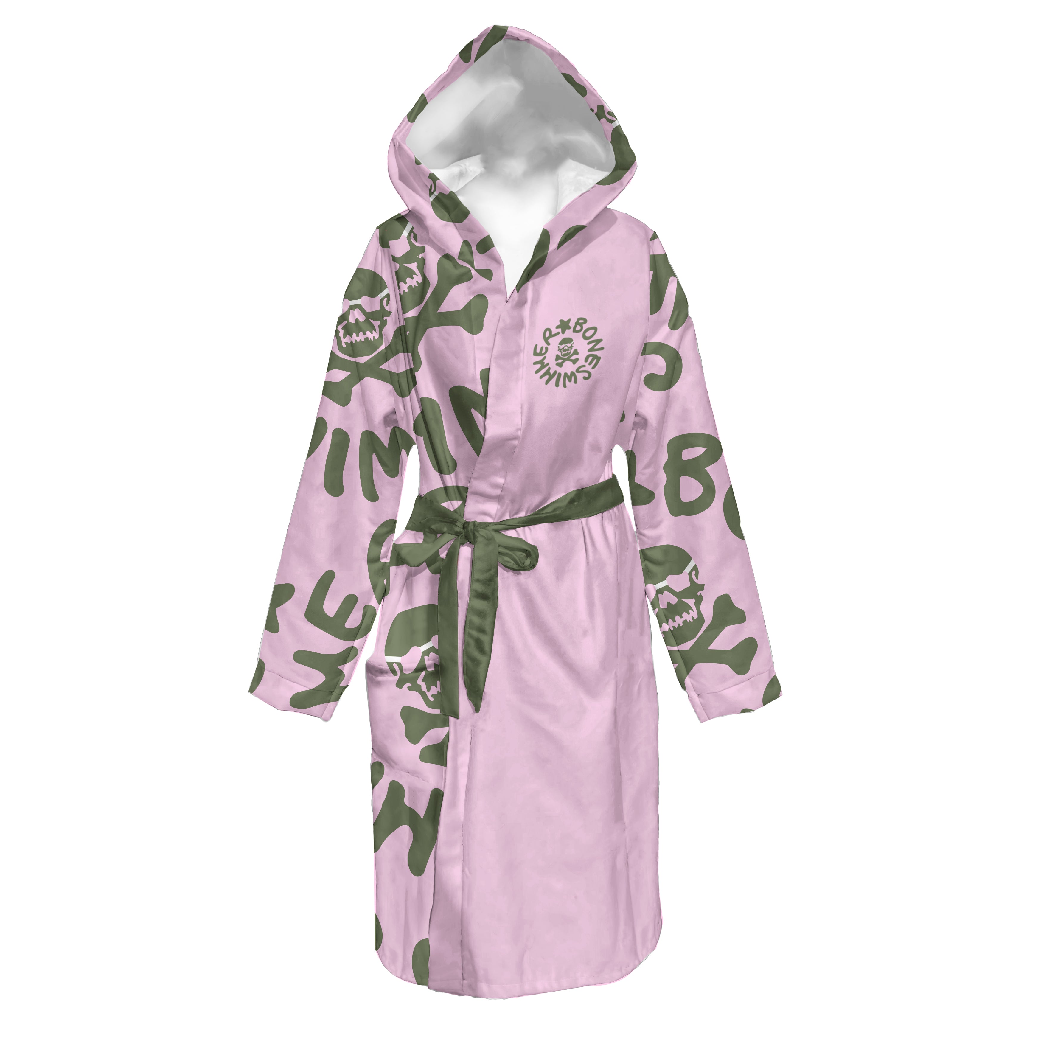 Boneswimmer zwembadjas van microvezel, met roze en militairgroen logo. Zacht, absorberend en snel drogend, het onmisbare accessoire voor comfort aan de rand van het zwembad.