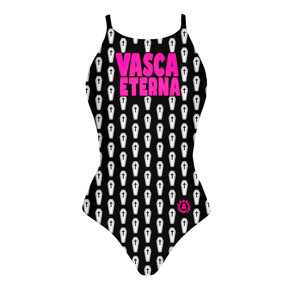 Stijl: de stijl van het badpak is opvallend ironisch en speelt met een grafisch patroon in elegant zwart-wit. Alleen is het herhaalde grafische element een kleine gestileerde doodskist. De zin "Eeuwig bad" speelt in op het gevoel dat elke zwemmer kent, van een zwembad dat nooit lijkt te eindigen, en de gelijkenis met een doodskist alsof het een badkuip is om voor eeuwig in te verblijven. Het concept knipoogt naar de zwembadsfeer van Boneswimmer, dat met iconische elementen zoals skeletten, schedels en botten al een eigen beeldtraditie heeft.