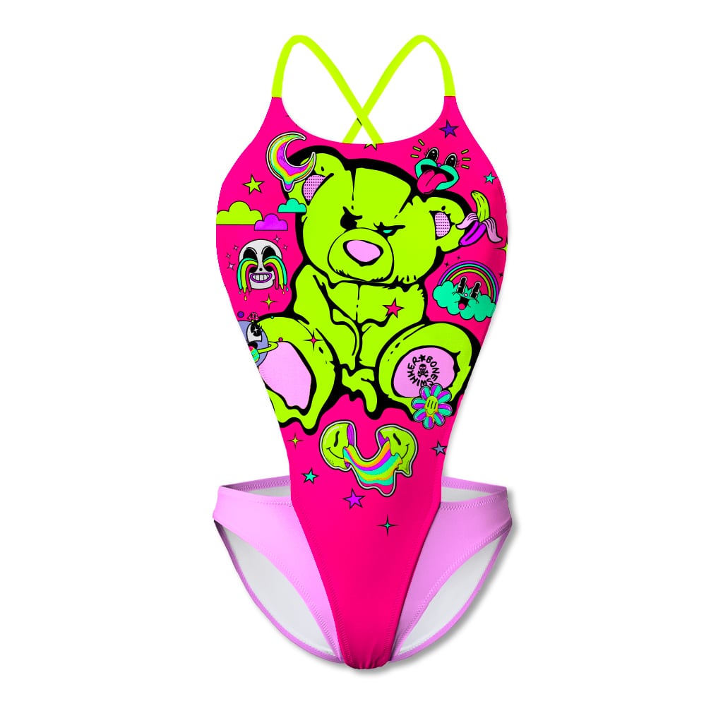 Stijl: een explosie van fluorescerende kleuren met een iconisch en uitdagend motief: een beertje getekend in streetart-stijl, met uitdrukkingen en grafische details die het eigenzinnige en speelse karakter benadrukken. De felroze basis, gecombineerd met fluorescerende limoengroene details en accenten in andere heldere kleuren, creëert een dynamisch en boeiend contrast dat meteen de aandacht trekt. De figuur van het “boze” beertje en zijn grafische uitdrukkingen stralen een gevoel van rebelse energie uit, maar met een vleugje ironie, bijna alsof het de opgelegde regels uitdaagt met een sardonische glimlach. Het is een badpak dat spreekt van een vastberaden, onafhankelijke en creatieve persoonlijkheid, die met stereotypen speelt zonder zichzelf te serieus te nemen.