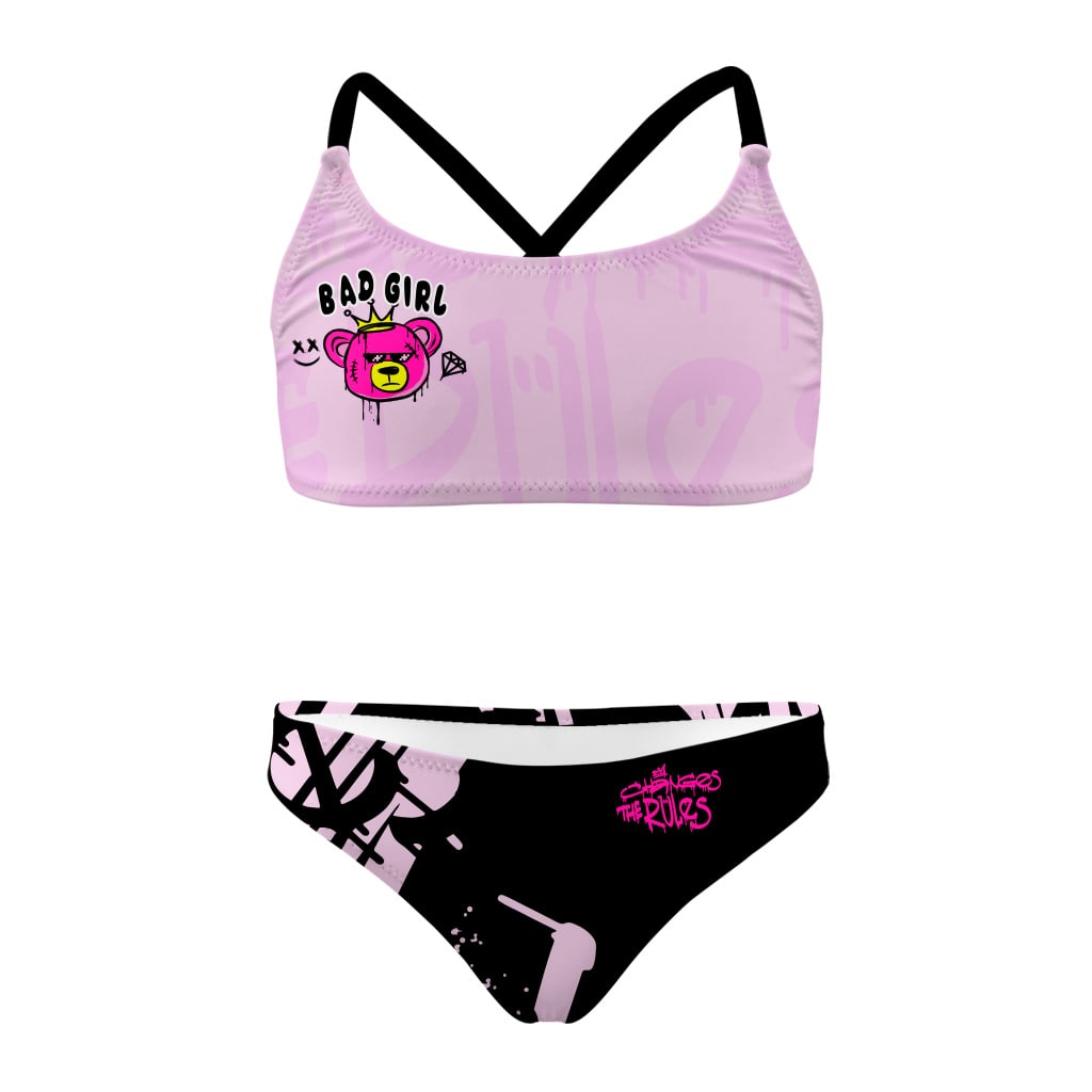 Stijl: krachtig en stedelijk, de roze en zwarte bikini met straatstijlafbeeldingen en teksten zoals “Bad Girl” is perfect voor meisjes die zich met persoonlijkheid en een vleugje rebellie willen onderscheiden. Het sportieve topje met zwarte gekruiste bandjes biedt comfort en steun, terwijl de bijpassende slip karakter en stedelijke stijl toevoegt, ideaal om de zee te beleven met energie, originaliteit en een flinke dosis rockgeest.