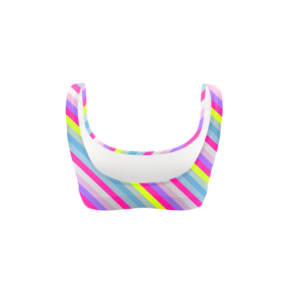 Stijl: kleurrijk en levendig, de mix van fluorescerende en pastelstrepen op een sportieve basis straalt meteen energie en vrolijkheid uit, en creëert een onweerstaanbaar pop-effect. De rechte snit met brede bandjes biedt steun en comfort, perfect voor wie een frisse, dynamische look wil die klaar is om te stralen tussen zon, golven en plezier.