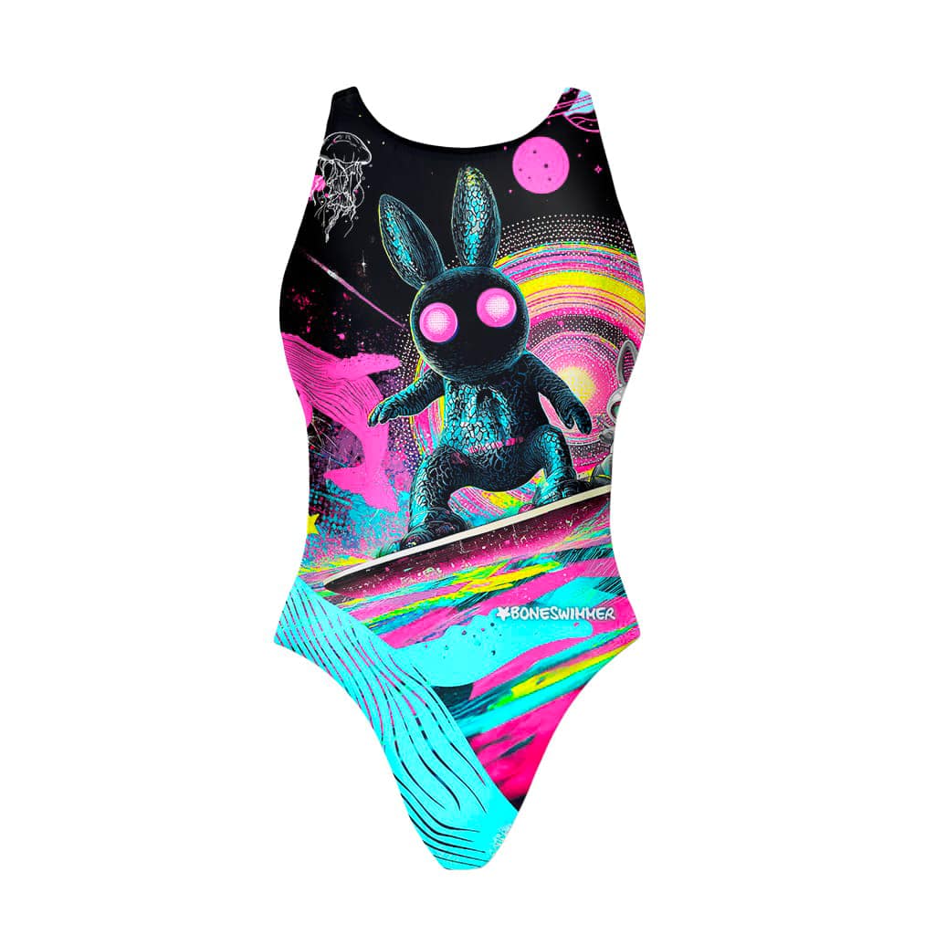 Meisjesbadpak voor training, model Pinup. "Astrosurf"-print: een kosmisch en levendig ontwerp dat de energie van de sterren naar het zwembad brengt, voor een look die niet onopgemerkt blijft.