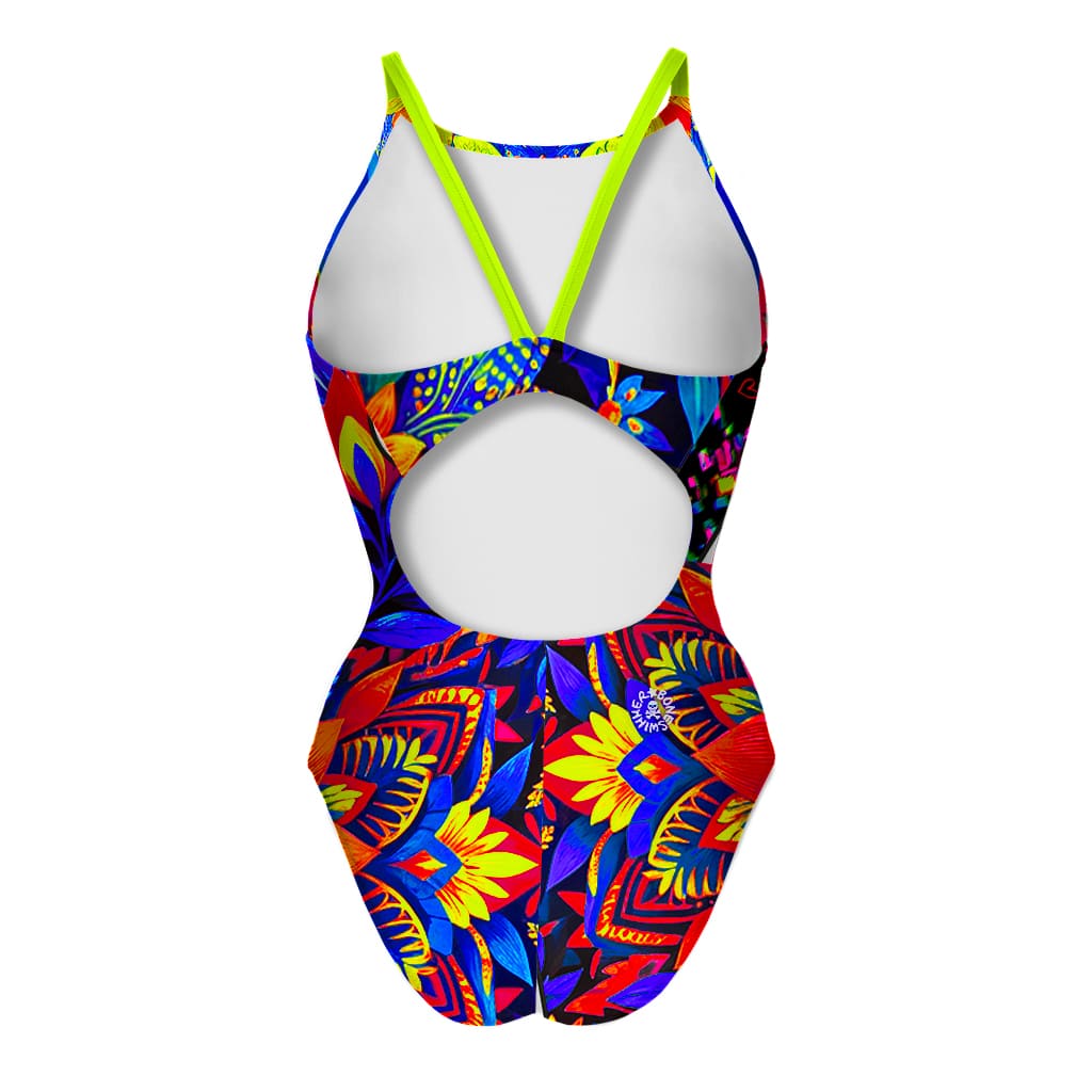 Badpak voor training, model Ibiza. Opdruk "Blauwe schedel": stedelijk landschap omlijst door een blauwe schedel, bloemen in warme en levendige tinten.