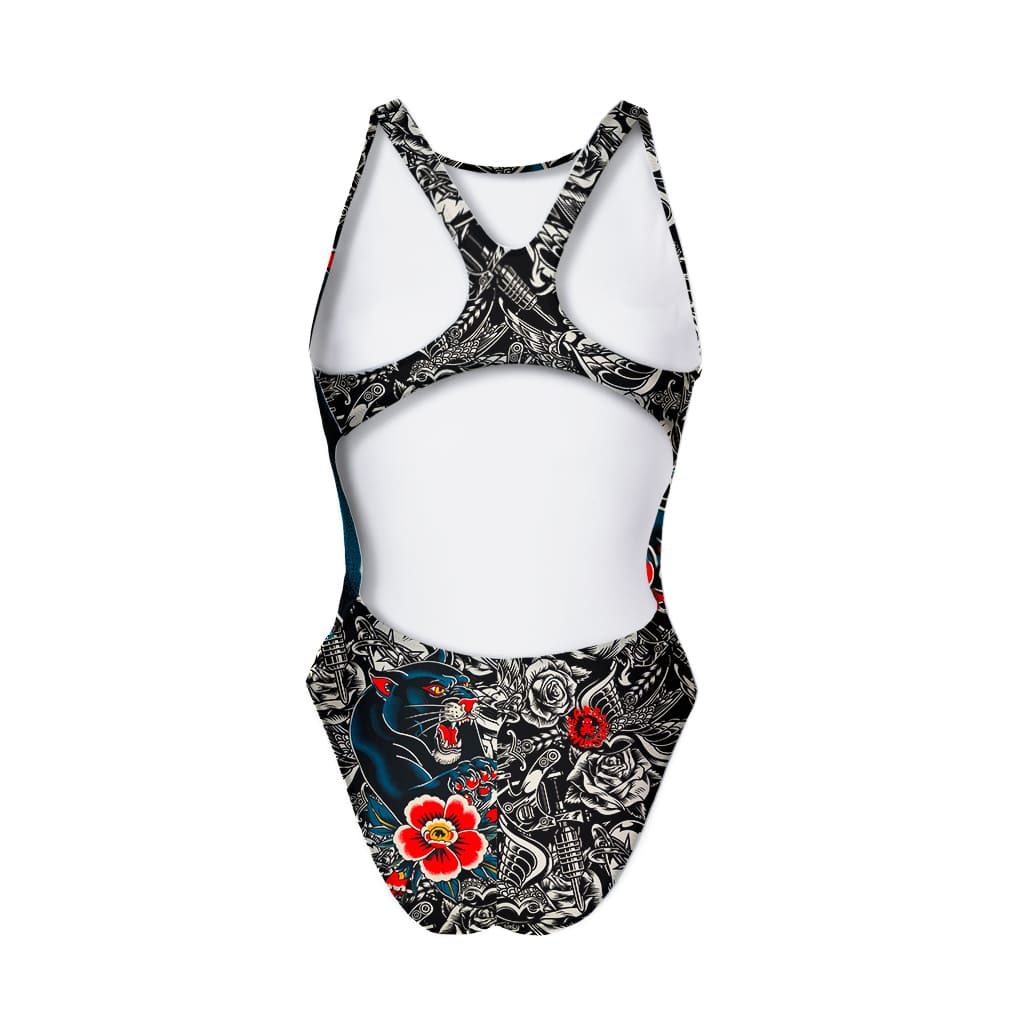 Trainingsbadpak, model Pinup. Print "Tattoo": popart, contrast van tattoo-kleuren, panter met helderrode bloem.