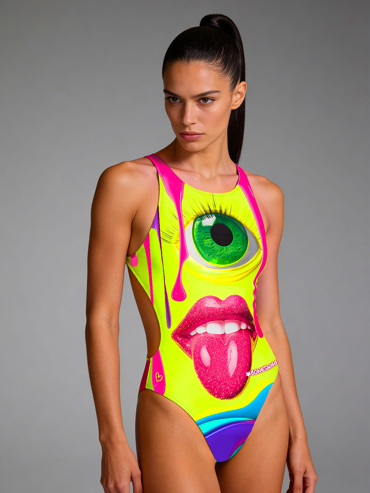 Trainingsbadpak, model Pinup. Print "Slime": gedurfd en uitdagend. Focus op een oog dat opvalt tussen de druppels slime.