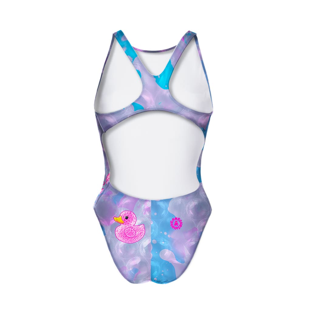 Trainingsbadpak, model Pinup. "Pluriball" print: bubbelfolie-effect opnieuw geïnterpreteerd in een popstijl, een ironische en speelse eend als hoofdrolspeler.