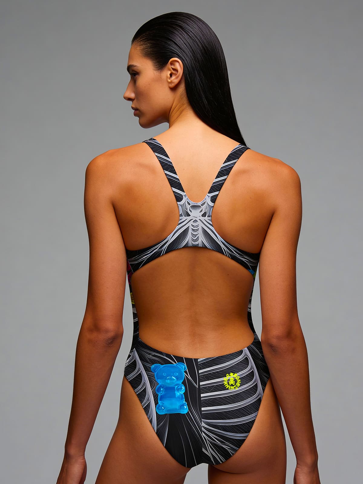 Een gedurfd en eigentijds visueel concept dat donkere esthetiek en popdetails samenbrengt. Het visuele contrast wordt versterkt door gekleurde snoepjes die de monochrome röntgenbeelden doorbreken. Het overheersende zwart geeft elegantie, mysterie en een sterk visueel effect, bedoeld voor zwemmers die zich willen onderscheiden met een alternatieve stijl, tussen donkere kunst, surrealisme en popcultuur.