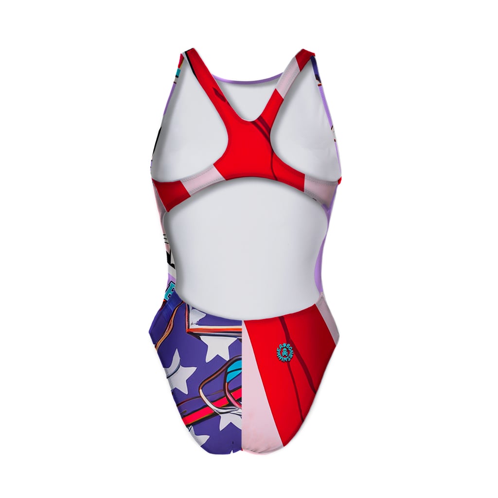 Trainingsbadpak, model Pinup. "Fly" print: een gestileerde vlinder in vlucht, symbool van lichtheid en transformatie, met grafische details die de dynamiek benadrukken.