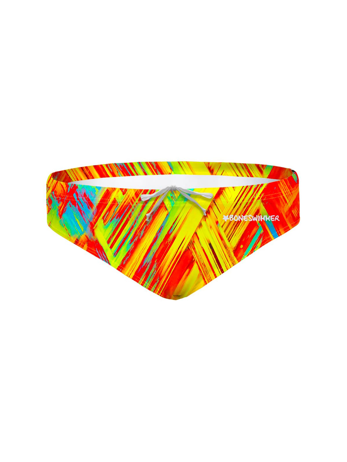 Trainingsslip badpak, model H2Otto. "Fusion" print: abstracte penseelstreken in tinten geel, rood, oranje en groen creëren een explosie van kleur op een donkere achtergrond. Een energiek ontwerp, bijna expressionistisch, om een sterke visuele impact te brengen tussen de banen.
