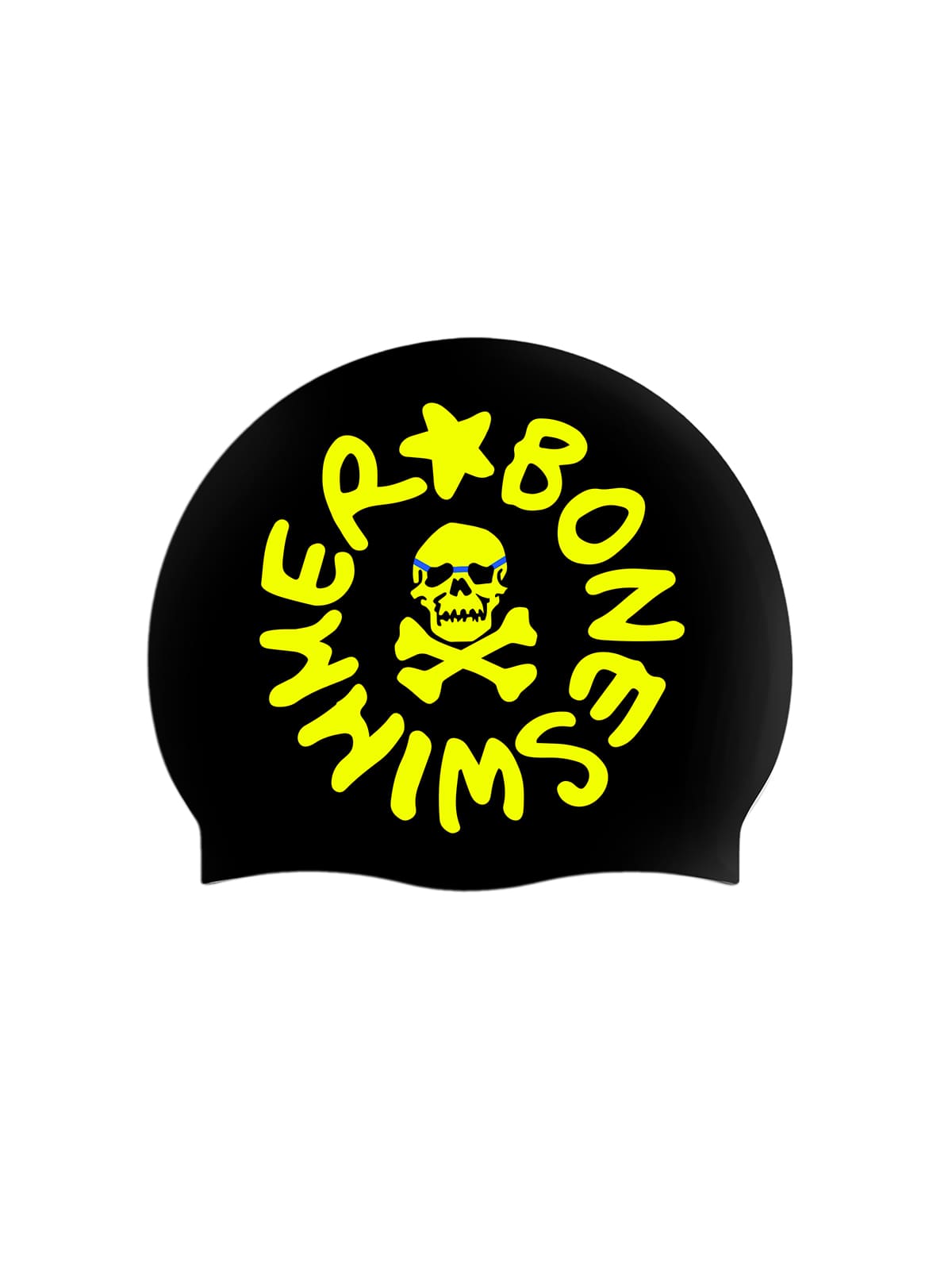 Zwemmuts van dik siliconen, zwarte achtergrond met groot geel logo, passend bij onze onconventionele badpakken.