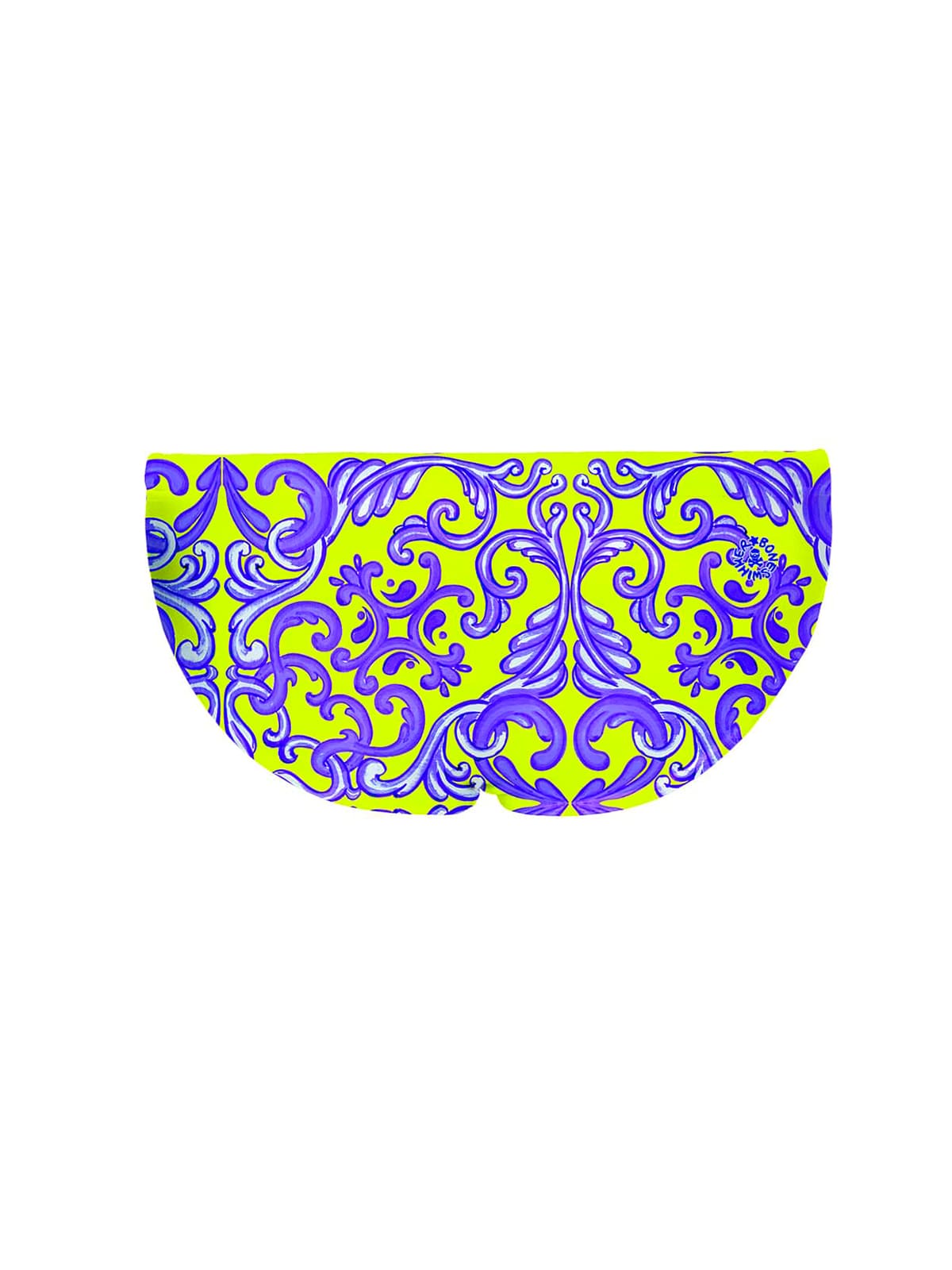 Print: elegante barokmotieven in blauw en paars op een heldergele achtergrond, voor een verfijnde en mediterrane look.