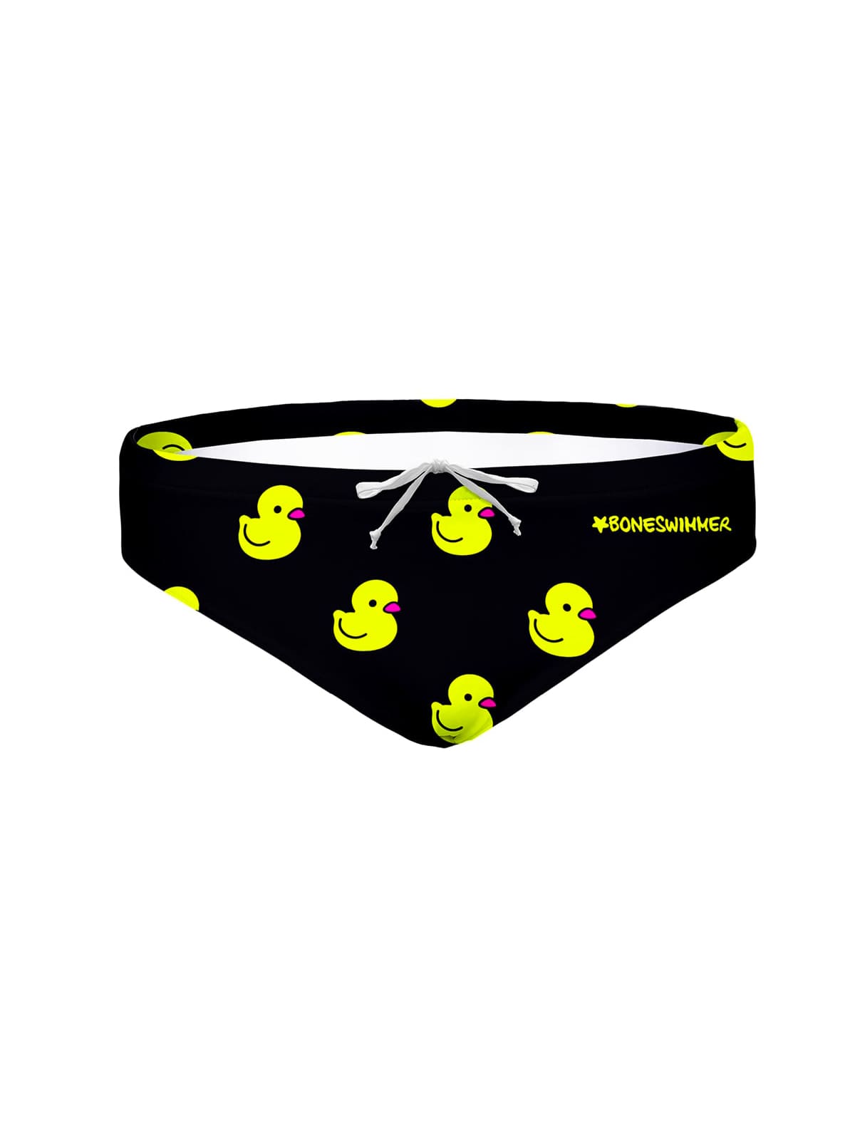 Print: levendige gele eendjes op een zwarte achtergrond, voor een ironische en zorgeloze touch bij het zwembad.