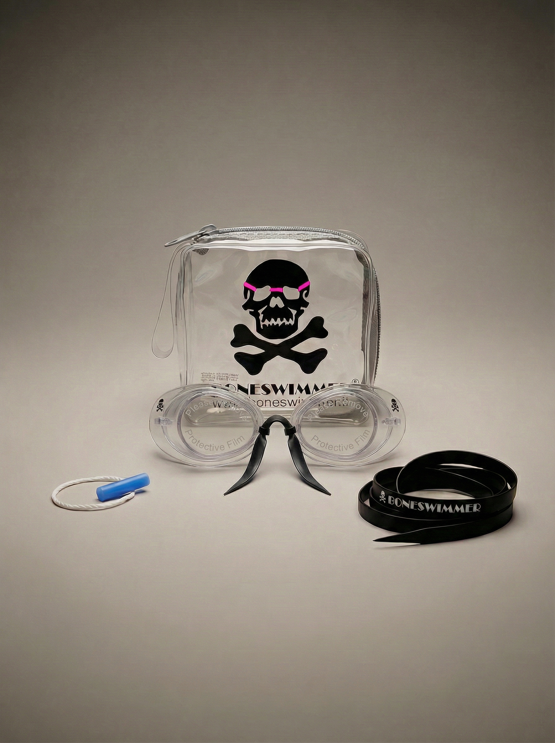 Zwembril BONESWIMMER uit Zweden, transparant model. Een iconisch ontwerp voor een kristalhelder zicht, het onmisbare accessoire voor de zwemmer die geen concessies doet.
