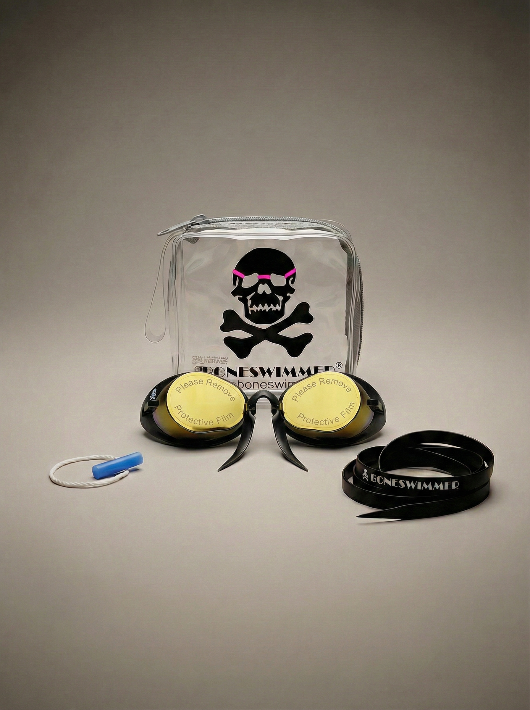 BONESWIMMER Zweedse zwembril met zacht siliconen montuur, afwerking in bruin goud met spiegelglans. Een iconisch accessoire dat prestatie en een weelderige uitstraling verenigt, voor een onmiskenbare houding op de baan.