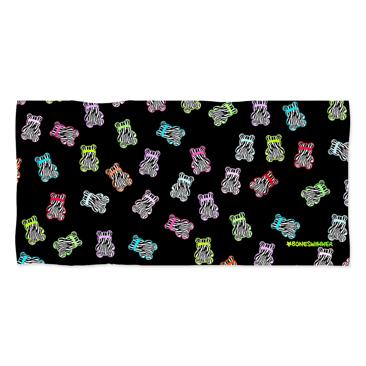 Stijl: grafiek met een pop en speels karakter, met een patroon van gestileerde beertjes met zebraprint die zich herhalen op een zwarte achtergrond. De stijl verwijst naar de esthetiek van street art en grafieken uit de jaren ’90, met fluorescerende kleuren en vibrerende lijnen die een dynamische look creëren. Het onderwerp – kleurrijke en ironische beertjes – voegt een leuk en zorgeloos tintje toe, ideaal voor wie persoonlijkheid en originaliteit wil uitdrukken, zelfs in het zwembad. Deze combinatie van aansprekend design en levendige print maakt de ABIBÒ-lijn perfect, niet alleen voor wedstrijdzwemmen en dagelijkse training, maar ook als iconisch kledingstuk om op te vallen in wateromgevingen.